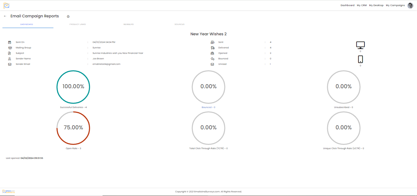 You will be presented with a Dashboard for of your campaign that display the successful deliveries, unsubscribes and bounces. You can also view the open rate, links that were clicked and revisited and clicked.