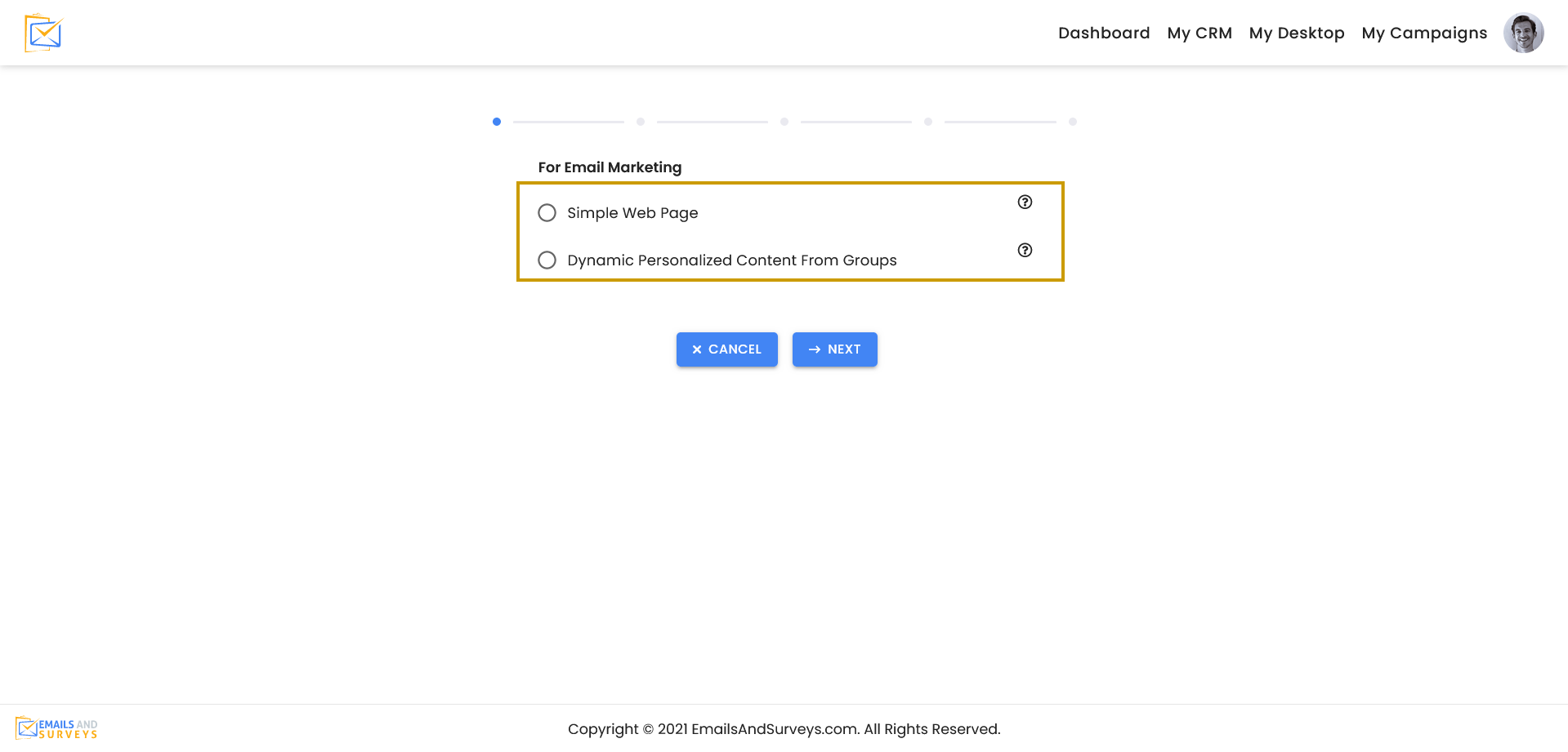 Every campaign requires an HTML page to be created. Once your page is created it can become a Landing Page, Online Form or Survey. The My Desktop area is where you build your campaigns. There are 7 Steps to building a Page for an Email Campaign.